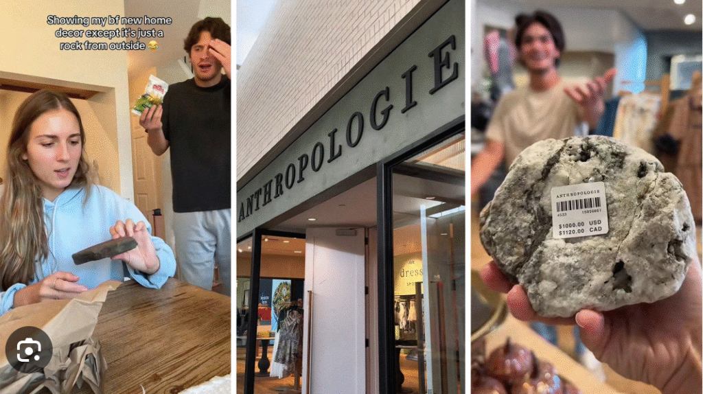 Left to Right: Phoebe’s initial TikTok, Anthropologie storefront, an in-store Anthropologie rock. Source: @phoebeadams112 on TikTok.