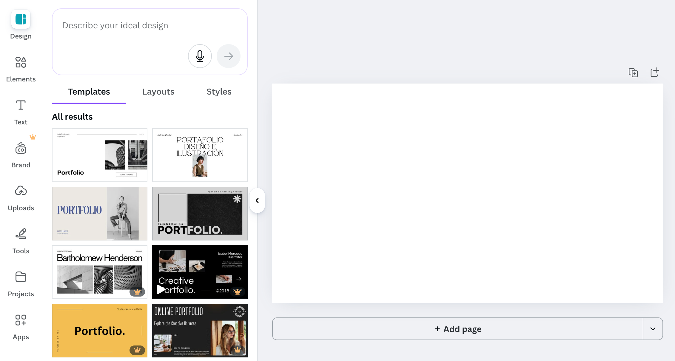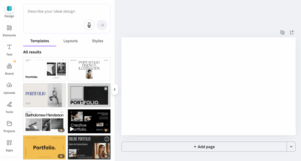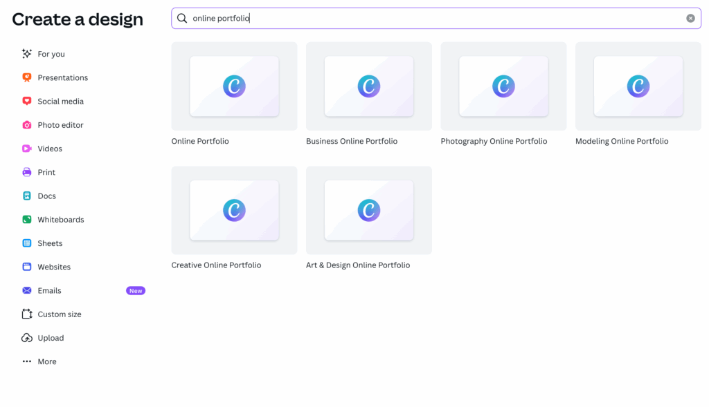 Once you’ve made your account you will be directed to the homepage. From the homepage, navigate to the left bar panel and select “Create.” This should be at the top of the panel. Next, enter “Online Portfolio” into the search bar and select the option that best suits your interest. Once you’ve clicked an option, you will be redirected into your project space. A new left side panel will appear. Select “Design,” at the top of this panel and scroll through the template options.