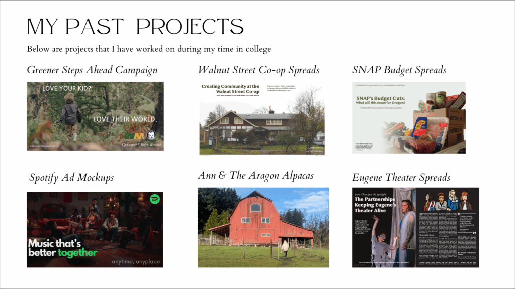 The next page you will build is an overview of your projects. Focus on 2-6 projects that you feel demonstrate your strongest work. This can include class projects, brand audits, mockups, passion projects, photography, writing samples, and more.